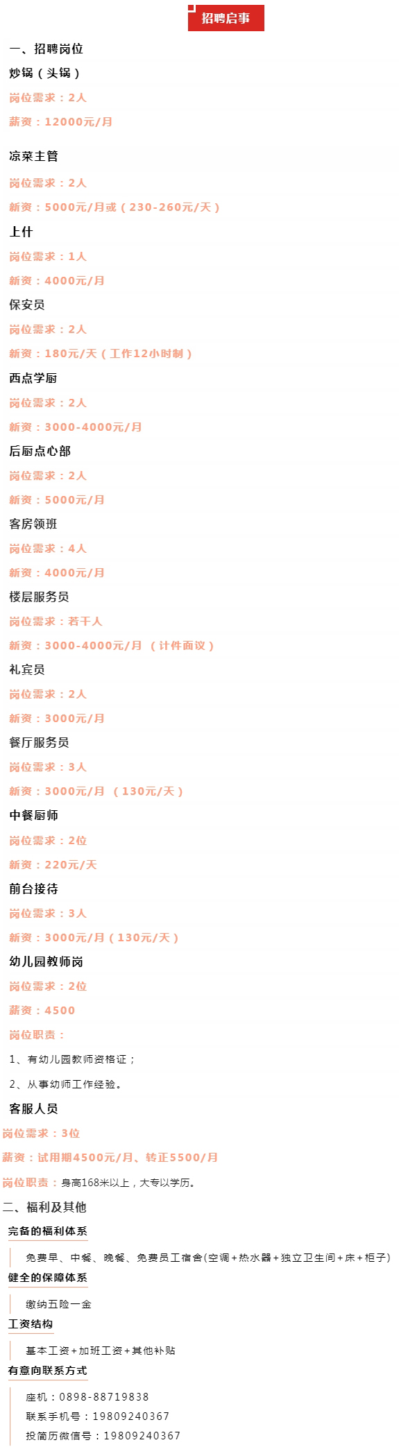 道格人力丨三亞國企酒店招聘若干崗位、公辦幼兒園招聘教師崗位